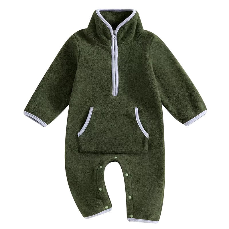 This cozy and stylish baby romper is perfect for keeping your little one warm and snug during the colder months. Featuring a half-zip design for easy dressing and a kangaroo pocket for a cute, functional touch, this romper is made from soft fleece fabric to provide ultimate comfort. The romper also includes snap closures at the legs for convenient diaper changes. Available in three adorable colors—cream, green, and brown—this romper is perfect for outdoor adventures or cozy days at home.