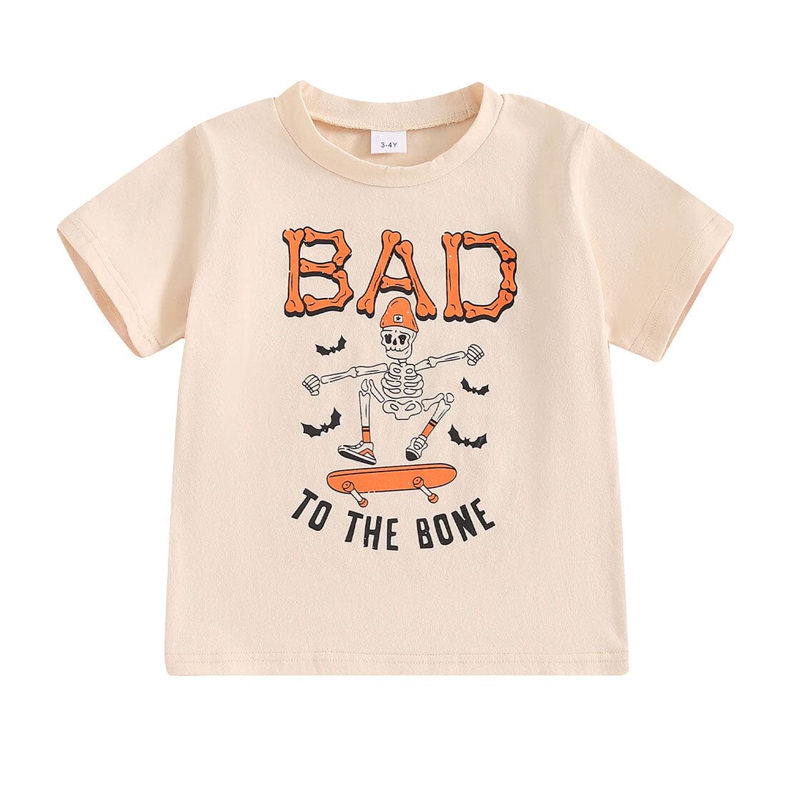 Get your little one into the Halloween spirit with this fun and spooky unisex toddler tee! Featuring a playful skeleton on a skateboard and the phrase "Bad to the Bone," this shirt is perfect for your tiny trick-or-treater. With its festive Halloween colors and cool design, this tee is ideal for wearing to Halloween parties, pumpkin patches, or just for some spooky fun at home. Let your little one show off their "bad to the bone" style in this must-have Halloween top!