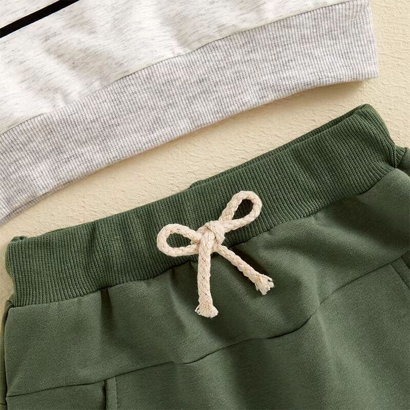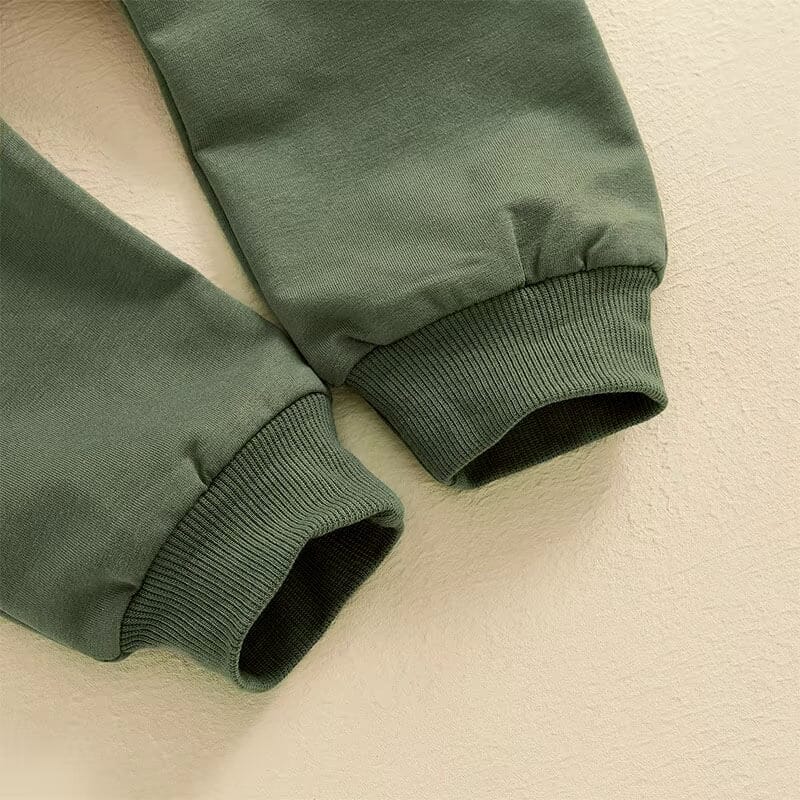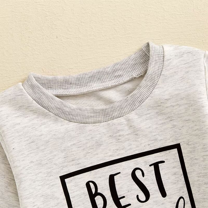 This adorable little boy set is the perfect way to celebrate the special bond between father and son, featuring a playful "Best Dad Ever" print on the sweatshirt. The comfortable two-piece ensemble combines a soft, heather gray top with stylish olive green pants, both made from soft, child-friendly materials that ensure comfort all day long. Ideal for casual outings or cozy days at home, this set is a wonderful gift for any proud dad to give his little boy.