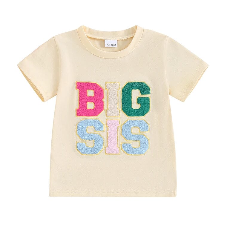This toddler girl tee is a vibrant and playful garment, perfect for the proud "BIG SIS" in the family. Available in two cheerful colors, each tee is adorned with the phrase "BIG SIS" in bold, multicolored block letters that stand out against the shirt's base color. The simple round neckline and short sleeves make it a comfortable choice for everyday wear. Whether she's out on a family excursion or playing at home, this tee is a great way for a big sister to wear her title with pride and style.