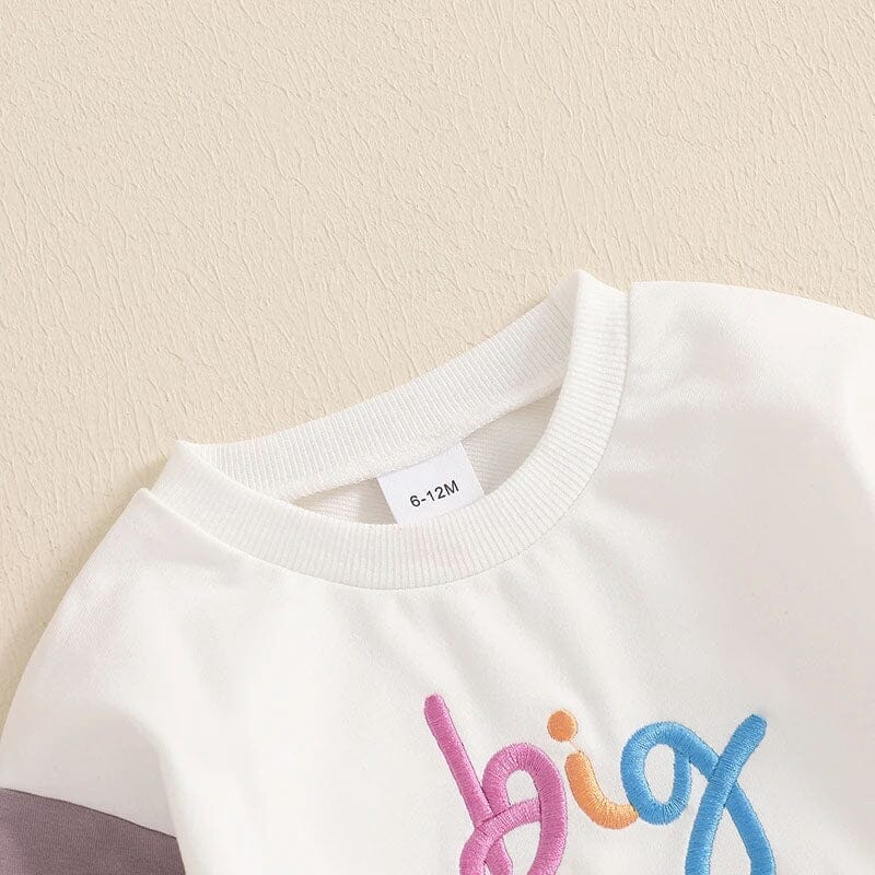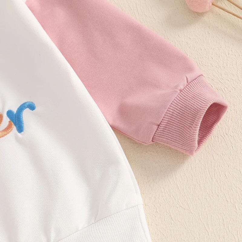 This charming toddler girl sweatshirt celebrates the pride and joy of being a big sister with its vibrant and colorful "big sister" embroidery on the front. The sweatshirt combines soft white with pastel sleeves in shades of lavender and pink, making it as stylish as it is comfortable. This sweatshirt is not only a cute addition to her wardrobe but also a lovely way to celebrate her role in the family, making it a thoughtful gift for any new big sister.
