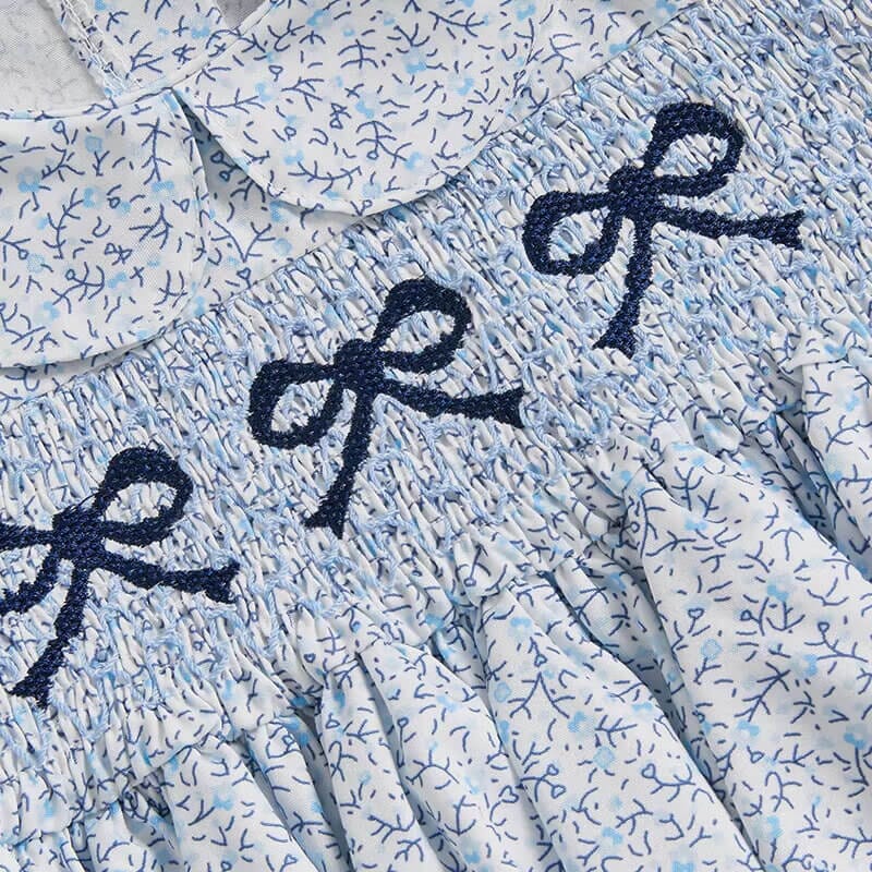 - Intricate smocking with sweet bow embroidery