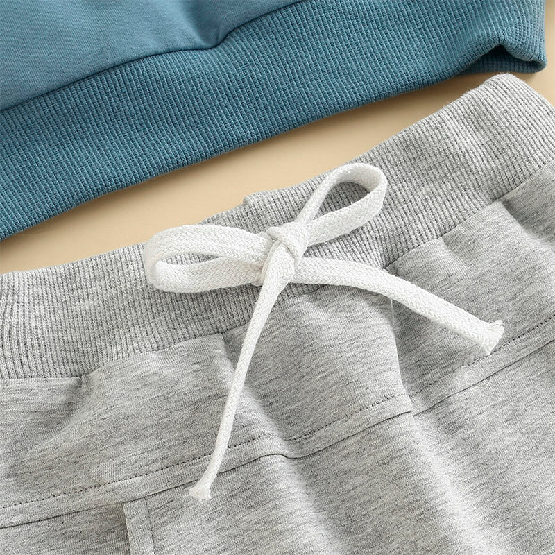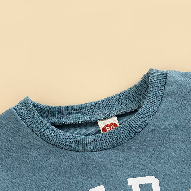 Your little boy will look adorable in this stylish and comfortable outfit! The soft blue sweatshirt features the cute and playful lettering "Bubs", adding a touch of fun to his everyday look. The solid gray pants provide a perfect complement to the top, with a comfortable fit and versatile style. Made from high-quality materials, this set is perfect for any occasion and will keep your little one looking stylish and feeling comfortable all day long.