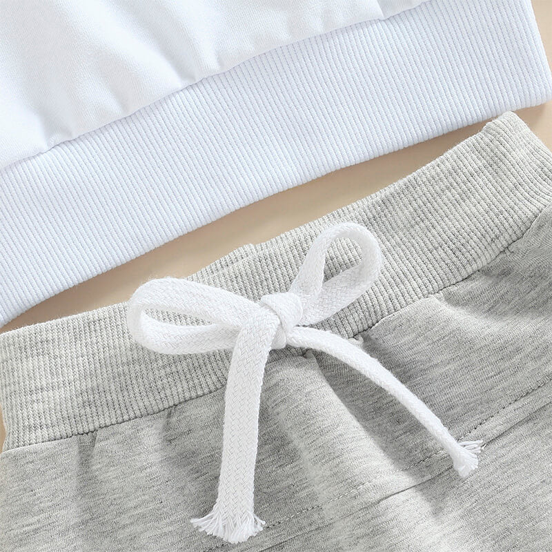 This cozy and stylish baby outfit is perfect for your mini Featuring a cute hoodie with lettering "Bubs" and solid pants, it is made from soft and comfortable fabric to keep your little one warm and comfy all day long.