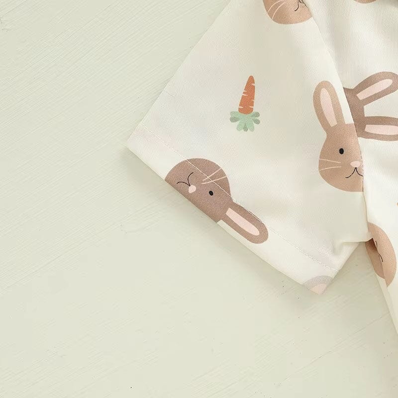 This adorable little boy set is perfect for celebrating Easter in style! Available in two delightful color options, the first features a white shirt with blue bunny and carrot prints paired with matching blue shorts, while the second showcases a beige shirt with playful bunny faces and carrot accents paired with light brown shorts. This set combines style and functionality, making it a must-have for your little one's Easter wardrobe!