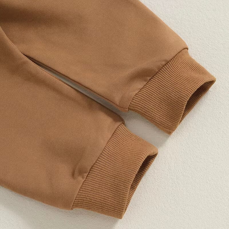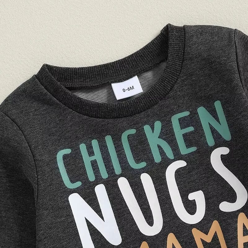 Dress up your little one in the cheeky charm of our 'Chicken Nugs & Mama Hugs' sweatshirt set. This playful outfit features a cozy, dark grey sweatshirt with fun, colorful lettering that captures the heartwarming bond between mom and child. Paired with soft, mustard-colored joggers that offer ample flexibility for all-day play, the set is perfect for casual outings or relaxing at home. It's an easy-to-wear ensemble that mixes snug warmth with delightful style, sure to be a hit at any playdate.