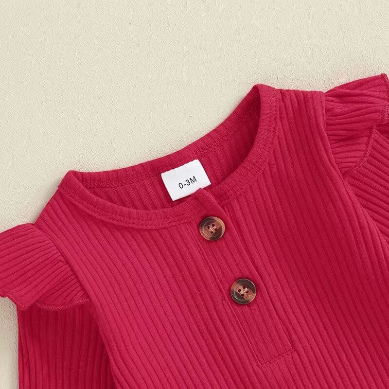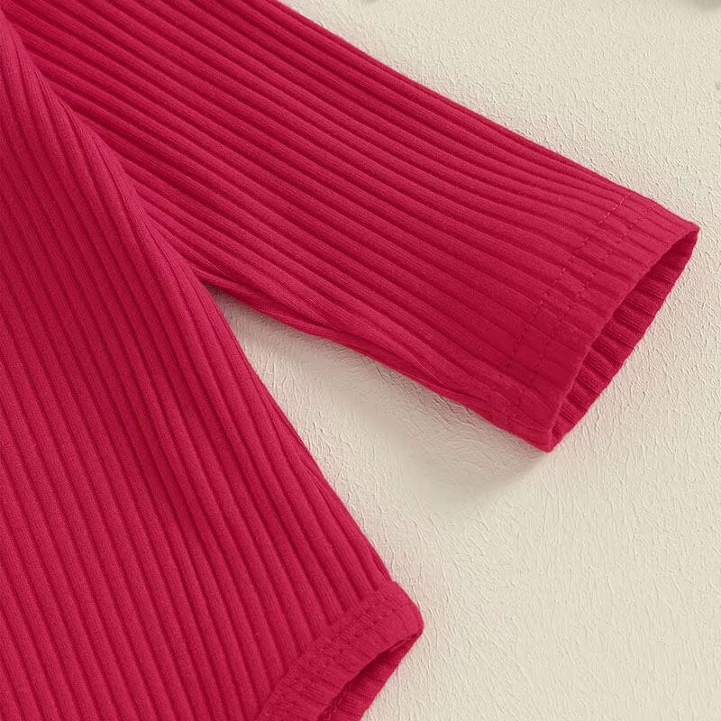 Deck your little one in our adorable Christmas ensemble, designed to spread holiday cheer and capture hearts. This charming set features a vibrant red bodysuit with elegant button details and cozy ribbed texture, ensuring your baby stays snug and stylish. Paired with it are playful bell-bottom pants adorned with a festive Santa print, complete with hearts and bows, adding a touch of whimsy to the holiday festivities. Gift your little angel this delightful outfit for a season filled with joy and adorable moments