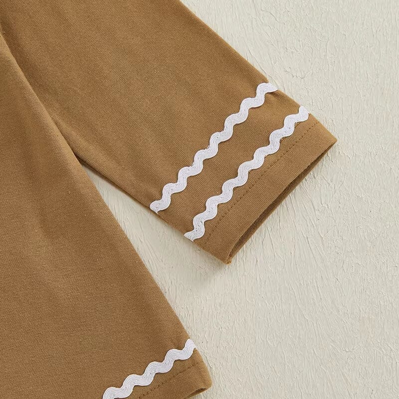 This delightful toddler girl dress captures the essence of the holiday spirit with its Christmas-inspired design. The rich mustard color serves as a cozy backdrop for the eye-catching green and red bow applique and candy cane buttons that adorn the front, adding a playful touch. Scalloped white trim along the hem and sleeves enhances the dress's festive appeal, making it perfect for Christmas gatherings.