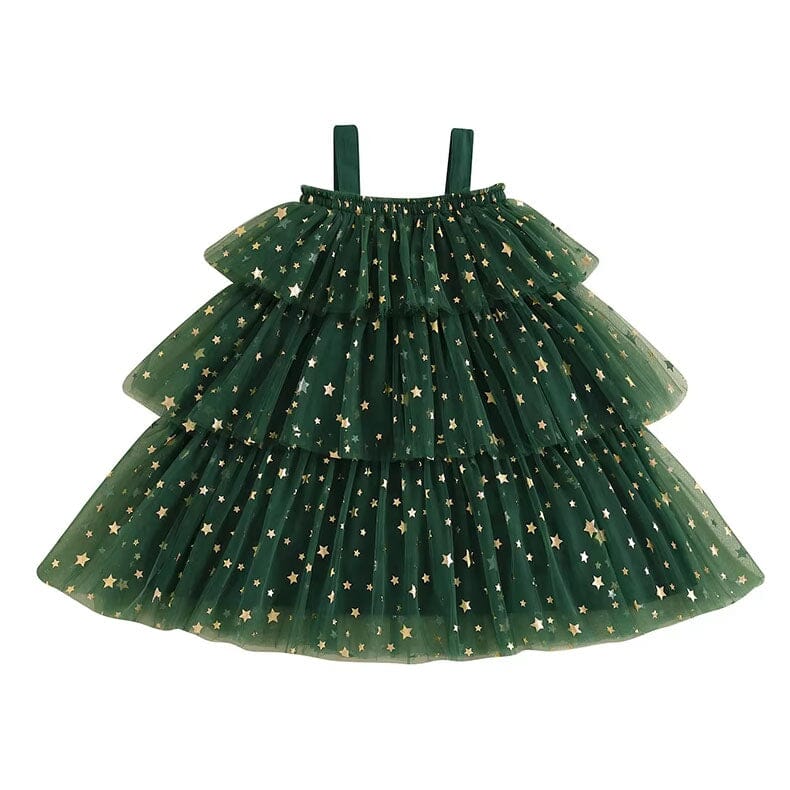 This enchanting toddler girl dress is perfect for Christmas celebrations, featuring a delightful star print that captures the festive spirit. The dress boasts a charming square neckline and a sleeveless design that keeps it comfortable yet stylish for little ones. Its tiered tulle skirt adds a magical touch, creating a voluminous silhouette that's perfect for twirling at holiday parties. Delicate details like the textured pom-poms scattered across the tulle bring a playful flair to the outfit.