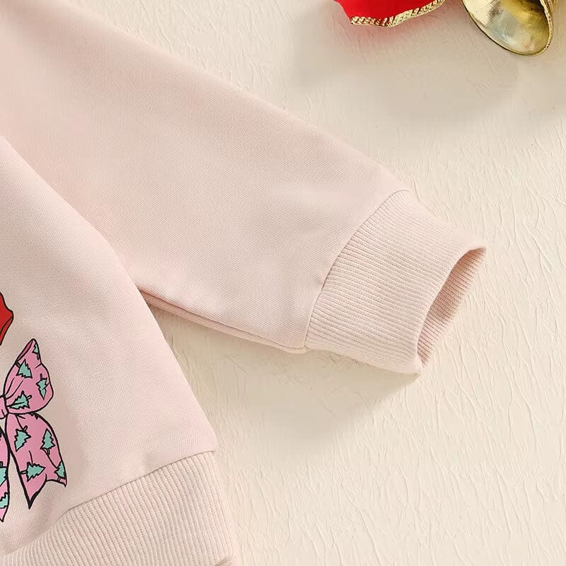 This charming toddler girl set features a festive array of colorful bows on a cozy sweatshirt, paired with playful pants adorned with bow prints, making it a perfect ensemble for the Christmas season. Soft, stretchable fabric ensures comfort throughout the day, whether it's unwrapping presents or attending holiday gatherings. This set combines style and comfort, making it an ideal choice for celebrating festive moments in true festive spirit.
