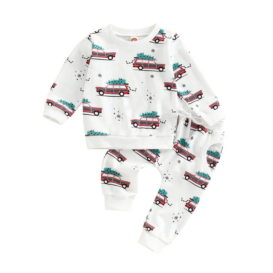 This festive baby ensemble features classic red cars, each adorned with a lush green Christmas tree, set against a crisp white backdrop. The outfit radiates holiday cheer, with snowflakes adding a touch of winter magic. Perfect for holiday photos or cozy indoor moments, this set is sure to make your baby the star of the season.