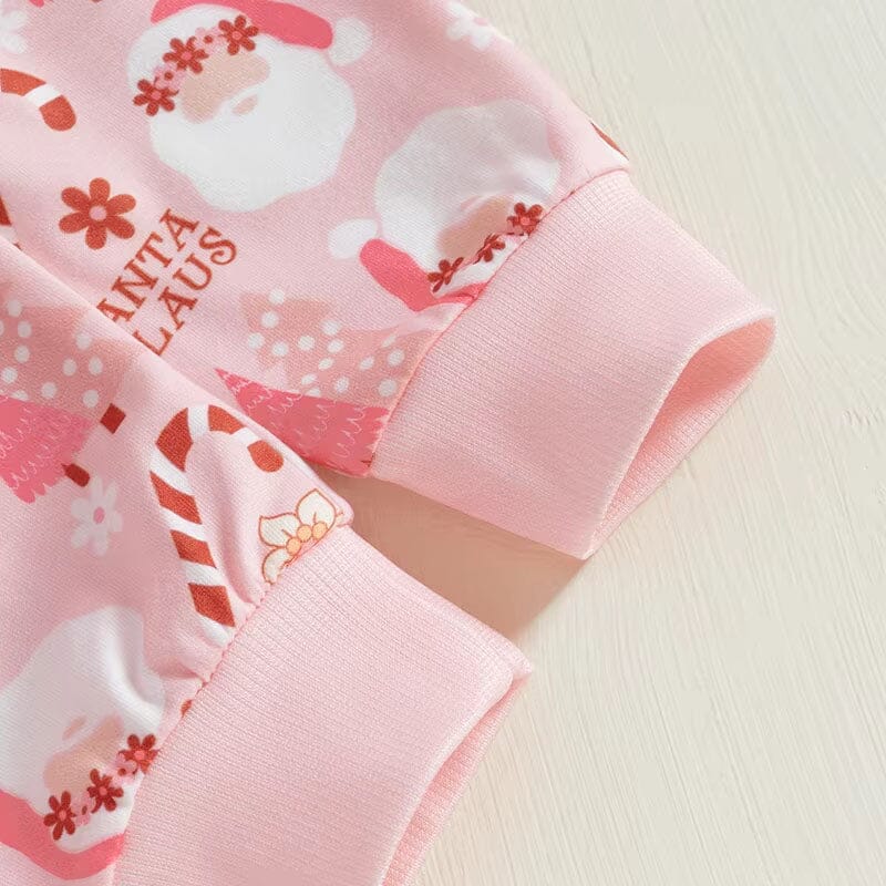 Celebrate the festive season with our adorable "Santa's Sweetheart" set, perfect for little girls this Christmas. This delightful two-piece outfit features a charming Santa Claus print in a soft pink palette, adorned with festive motifs and playful ruffles on the shoulders. Perfect for holiday photos, family gatherings, or just lounging at home, this set is a must-have for your baby girl's winter wardrobe. It also makes a wonderful gift for new parents during the holiday season.