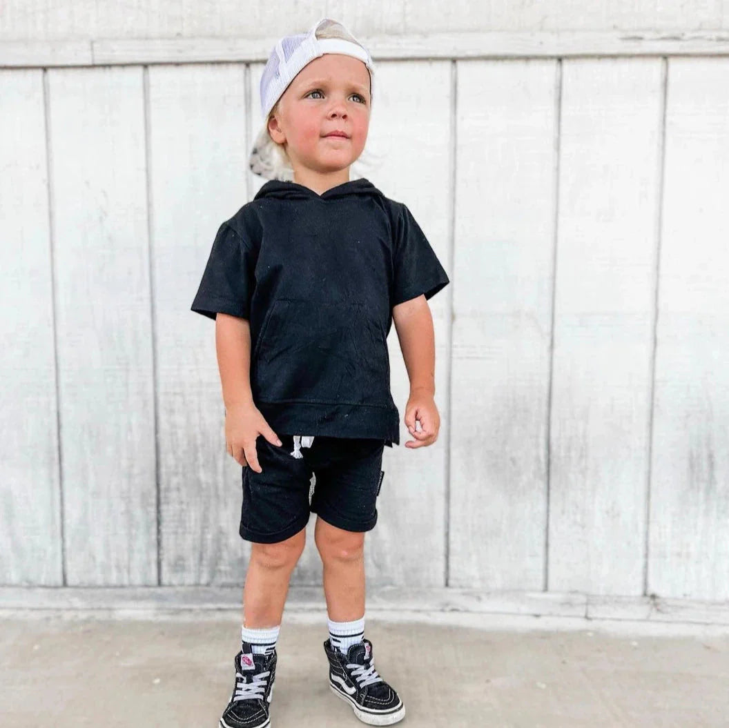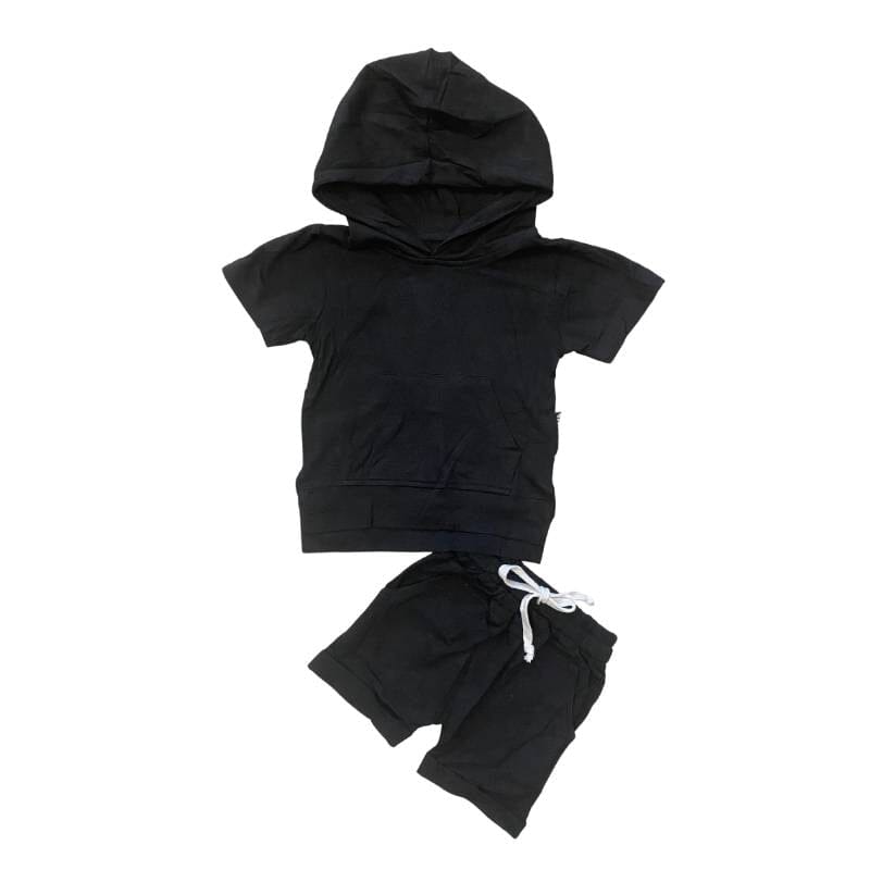 Upgrade your summer wardrobe with our Classic Black Summer Set. Made from soft bamboo, this set is a must-have for any closet. The drawstring shorts hit above the knee for a flattering fit, while the short sleeve top features a hood for added style. With its super soft material and high-quality construction, it's the perfect option for transitioning into summer. Don't miss out on this versatile and comfortable set!