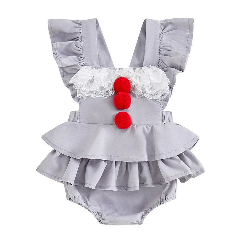 This adorable baby romper is a charming choice for your little one's Halloween festivities. Designed in a soft and elegant gray color, this romper features playful red pom-poms down the front, giving a nod to a classic, iconic character. The ruffled sleeves and layered skirt add a whimsical touch, making it perfect for a fun and festive costume. The delicate white lace around the neckline enhances the romper's vintage-inspired look. Whether you're heading to a Halloween party or going trick-or-treating, this romper will make your baby the star of the show.