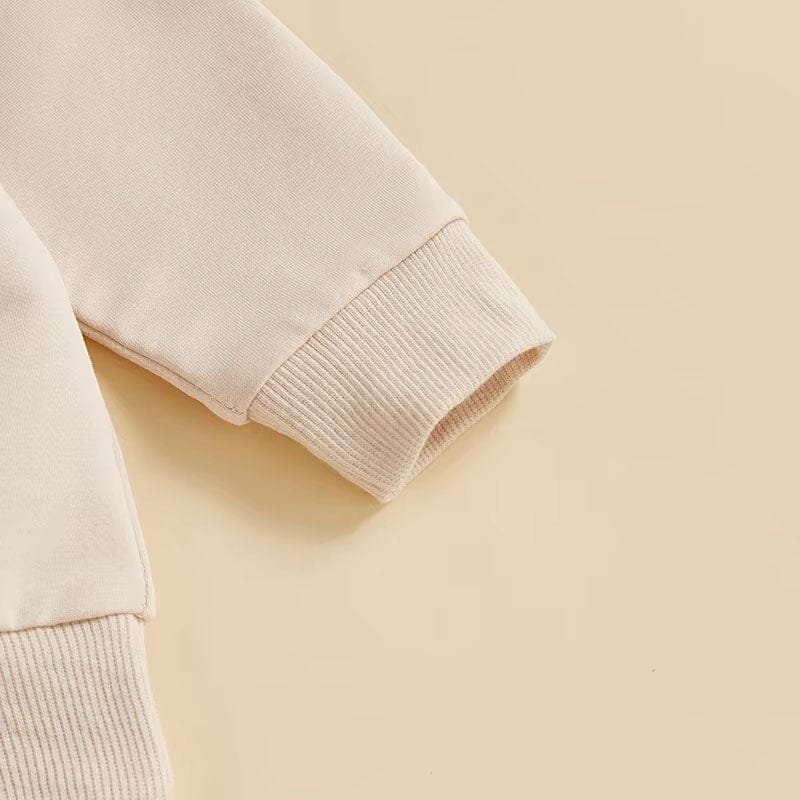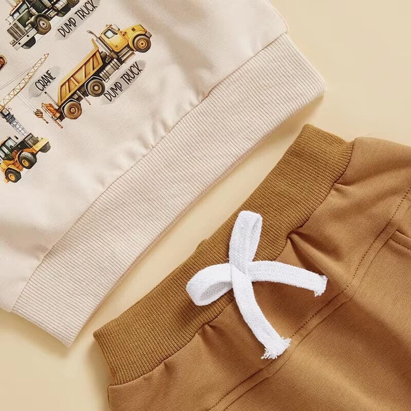 Gear up your little builder with our charming 'Construction Trucks' toddler set, perfect for your active little one who loves to play and explore. The set includes a soft, cream-colored sweatshirt featuring detailed prints of various construction vehicles, making it a hit for any young enthusiast. Paired with durable tan joggers that boast a comfortable fit and a stylish white drawstring, this outfit is designed for both comfort and fun.