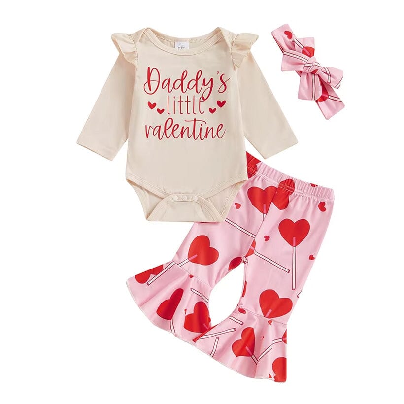 Celebrate the season of love with this charming baby girl set, perfect for your little Valentine. The soft, cream-colored bodysuit features a playful "Daddy's little Valentine" message that adds a sweet personal touch, ideal for festive photoshoots. Paired with heart-patterned pants in vibrant pink, this outfit is both comfortable and stylish, ensuring your little one stays cozy all day. This adorable set is the perfect way to make your Valentine's Day extra special with your little one.
