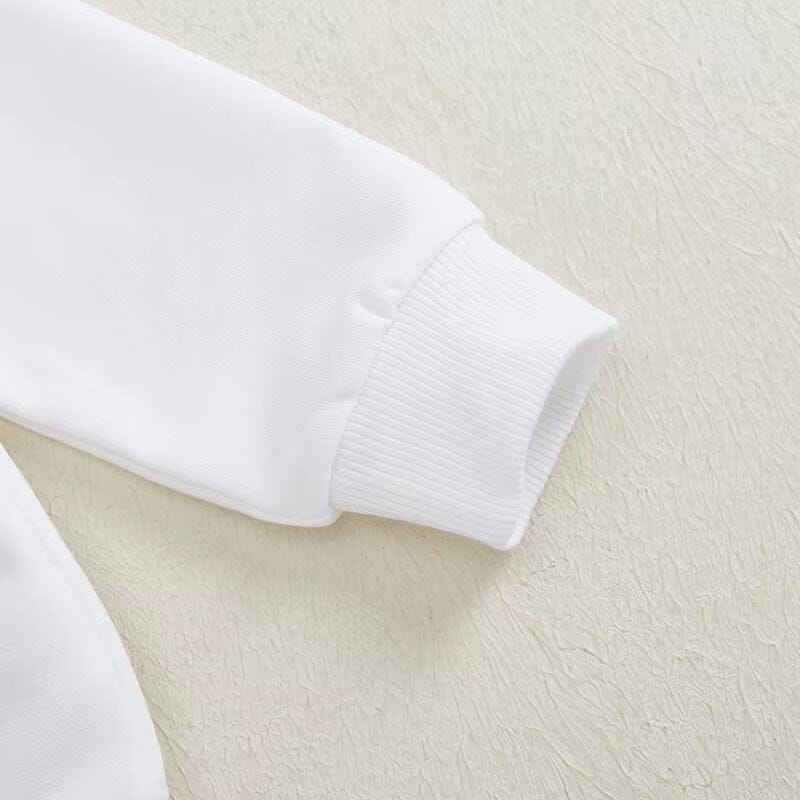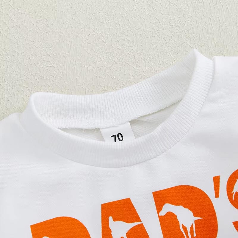 This charming little boy's set is the ultimate statement of cool for "Dad's little dude." The white sweatshirt is boldly printed with vibrant orange lettering, making it pop with youthful energy. Complementing the top are pants adorned with a playful dinosaur print, adding a touch of whimsy and fun to everyday play. It's not just an outfit; it's a way to bring smiles and style to any little boy's wardrobe.