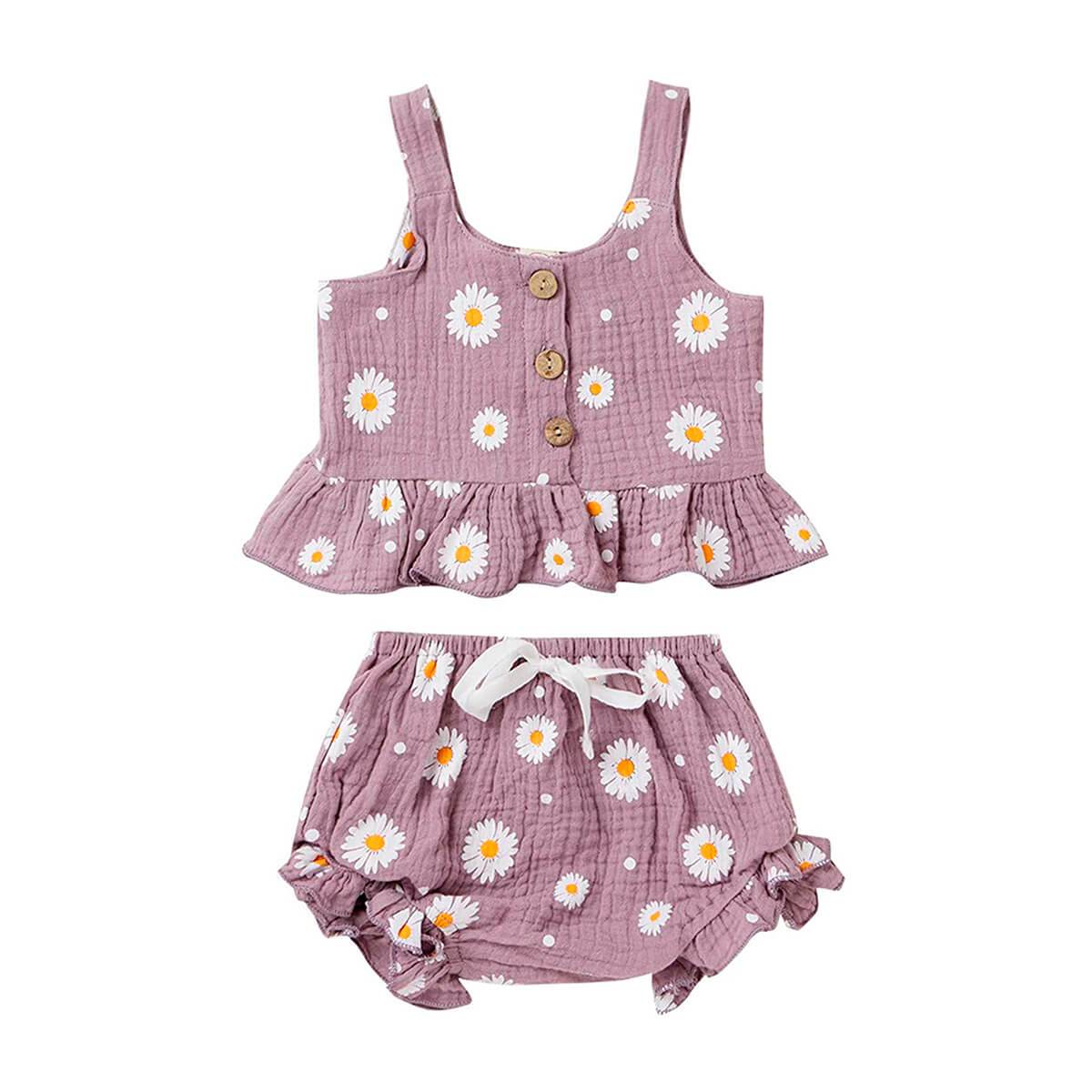 This adorable toddler girl outfit includes a ruffled top with a charming daisy print and matching shorts that are perfect for warmer weather. The soft and comfortable fabric will keep your little one feeling comfortable all day long, while the elastic waistband ensures a secure and snug fit. Whether worn for a day of play or a family outing, this set is sure to keep your little one looking stylish and feeling happy.