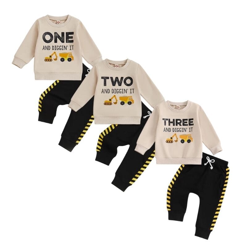 These construction-themed birthday outfits are perfect for your little one who’s “diggin'” their big day! Featuring fun construction vehicle graphics and playful slogans like “One and Diggin' It”, “Two and Diggin' It,” or “Two and Diggin' It,” these sets are great for first, second or third birthday celebrations. The beige tops are paired with black joggers that have bold yellow-striped accents, reminiscent of construction zone tape. Made from soft and comfy fabric, these outfits ensure your child will be ready for action and birthday fun!