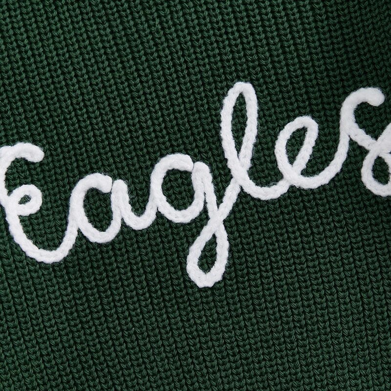 This charming unisex baby sweater is a must-have for young Philadelphia Eagles fans. Crafted in a rich forest green hue, the sweater features the team's name, "Eagles," elegantly embroidered in white across the front. Made from a cozy and soft material, it ensures warmth and comfort during those chilly game days or casual outings. Ideal for showing team spirit, this sweater is a great way for the littlest fans to join in on the fun during football season.