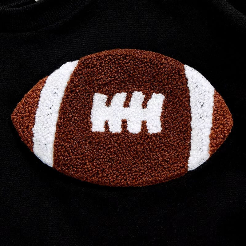 Get ready for game day with this stylish toddler boy set that sports a football theme, perfect for little sports enthusiasts. The set features a black sweatshirt with a textured football appliqué that adds a fun, tactile element for kids to enjoy. Paired with checkered pants in a complementary brown hue, this outfit blends classic style with sporty flair. This set is an excellent choice for family gatherings during sports seasons or just for a casual, playful look.
