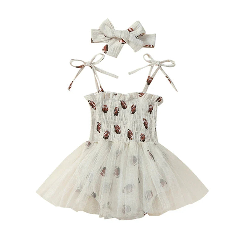 This baby girl's romper is a charming choice for any football fan, perfect for game day festivities. The design features an adorable football print scattered across a light backdrop, creating a playful yet sporty look. Each football is detailed and stands out, bringing an energetic vibe to the outfit. The soft, lightweight fabric ensures maximum comfort for your little one, whether she's cheering on the team or enjoying a family outing.