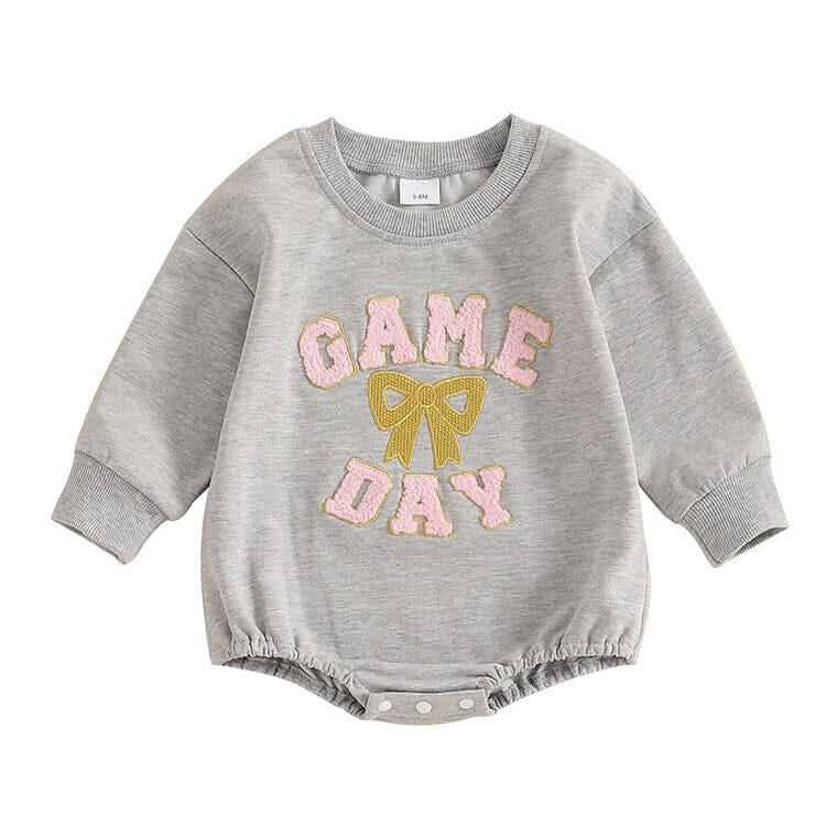 This charming baby girl bodysuit is perfect for celebrating game days with a touch of femininity. Featuring the festive embroidery "Game Day" with a cute bow, it's tailor-made for little cheerleaders in training. This outfit pairs wonderfully with other sporty accessories, making it a stylish choice for any football-loving family's youngest fan.