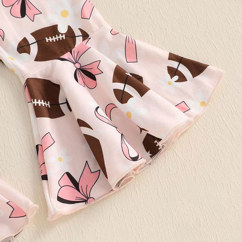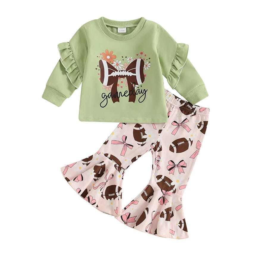 Dress your little cheerleader in style with this adorable football-themed set, perfect for game day! The soft, mint green top features ruffle detailing on the sleeves and a delightful "game day" graphic complete with floral and bow accents, making it both sporty and sweet. The coordinating pants boast a fun pattern of footballs and bows, adding a playful twist to the ensemble.It's a great way for the youngest fans to show their spirit and stay comfy during any game day gathering.