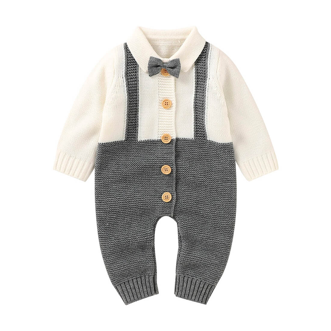Dress up your little man in this stylish knitted jumpsuit! Featuring long sleeves and buttons along the front for easy dressing and diaper changes, this jumpsuit is perfect for cooler weather. It's an ideal choice for any formal occasion or simply a day out with the family. Made with soft and comfortable materials, your little gentleman will look dapper and feel cozy in this knitted jumpsuit.