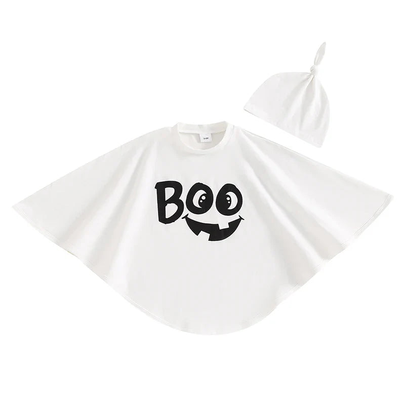 This cute and playful ghost costume is ideal for your little one's Halloween fun. The set includes a white poncho with a cheerful "BOO" graphic and a happy ghost face, adding a touch of whimsy to the spooky season. The costume also comes with a matching hat featuring a cute knot detail, completing the adorable look. Made from lightweight and comfortable fabric, this outfit is perfect for trick-or-treating, Halloween parties, or dress-up play, ensuring your child enjoys all the festivities in style.