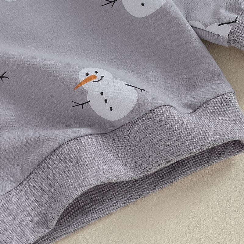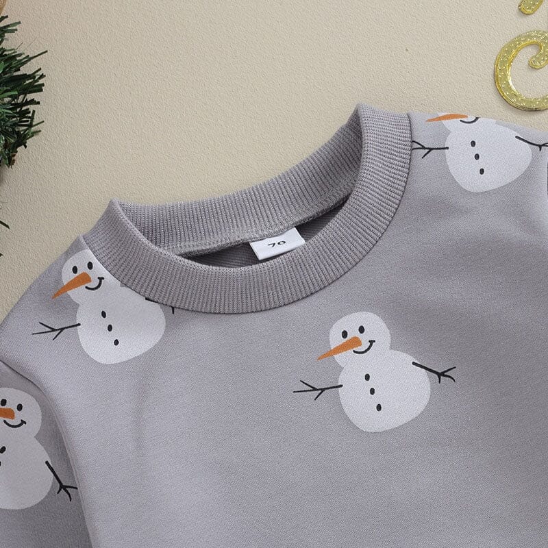 Add a sprinkle of festive charm to your baby's winter wardrobe with this sweatshirt. This unisex top is adorned with adorable snowman prints, capturing the essence of holiday cheer. Crafted from soft, breathable fabric, the sweatshirt ensures your little one stays cozy throughout the holiday season. The neutral gray color makes it versatile enough to pair with any bottoms, while the snowman prints make it unmistakably Christmassy.