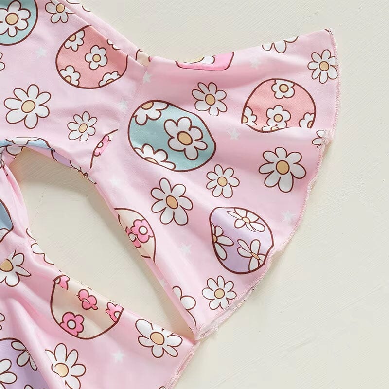 Jump into the spirit of Easter with this adorable toddler girl set, featuring a vibrant "Hip Hop" carrot-themed graphic on a crisp white tee. The matching pink flared pants, adorned with a playful Easter egg and floral print, bring a burst of springtime cheer to any outing. It's an ideal choice for capturing those memorable Easter moments in style and comfort.
