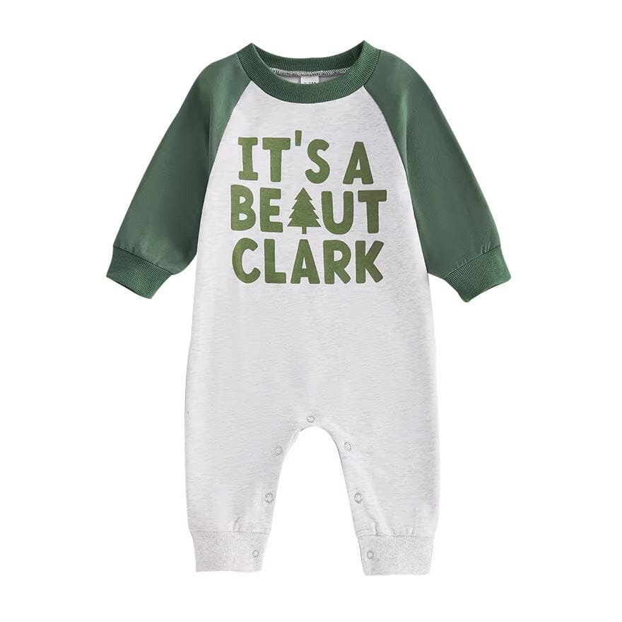 Celebrate the holiday season with this charming unisex baby jumpsuit, a nod to classic Christmas movie charm. The jumpsuit is adorned with the whimsical phrase "It's a Beaut Clark," referencing a beloved holiday film, making it a festive favorite for family gatherings. Easy to slip on and off, this jumpsuit comes with convenient snap closures at the bottom to simplify diaper changes during the busy holiday festivities.
