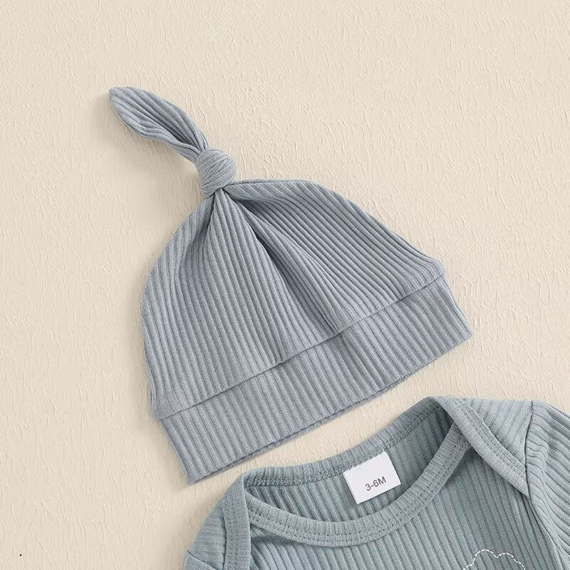 Welcome the newest gentleman to the family with this elegant baby boy set, proclaiming "It's a Boy!" in soft, pastel embroidery. The ensemble includes a long-sleeve bodysuit, cozy pants, and a stylish knotted hat, all in a ribbed fabric that's gentle on baby's skin. The bodysuit features convenient snap buttons for easy diaper changes and a comfortable neckline. Perfect for baby announcements or a thoughtful gift, this outfit combines charm and practicality for any new arrival.