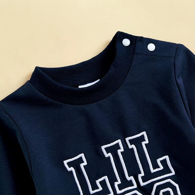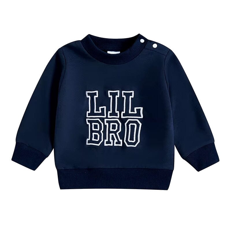 Introducing our cozy 'LIL BRO' sweatshirt, perfect for the coolest little brother around! This deep navy sweatshirt is crafted from soft, durable fabric that's gentle on baby's skin while keeping him snug and warm. The sporty, white embroidered lettering adds a bold contrast that stands out in any little wardrobe. A must-have for family outings, this sweatshirt is as practical as it is adorable!