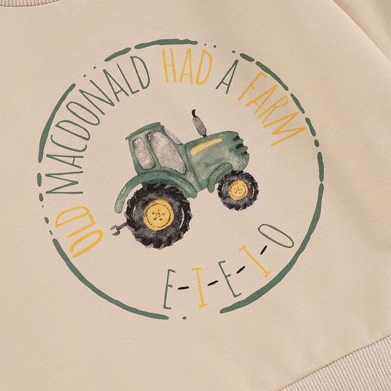 Introduce a dash of rural charm to your toddler's wardrobe with our farm-themed sweatshirts, available in two playful styles. The first style showcases a whimsical tractor design with the caption "Old MacDonald had a farm," invoking the beloved nursery rhyme. The second style highlights a vintage truck with the phrase "Dibs on the buddy seat," perfect for little adventurers.