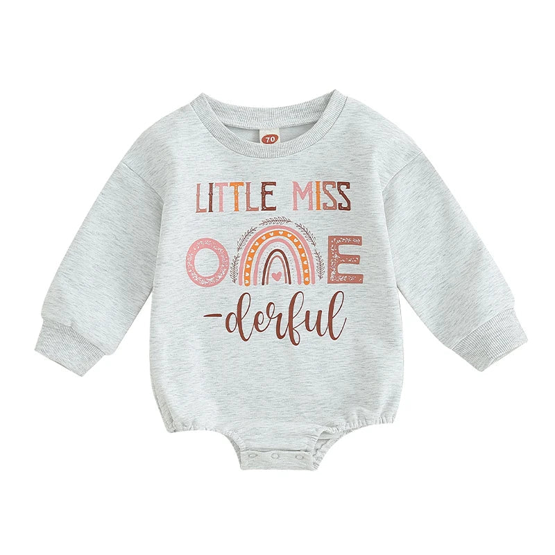 Celebrate your little one's special milestone with this adorable "Little Miss One-derful" romper! Perfect for a first birthday, this cozy and stylish outfit features a lovely rainbow graphic and rose-gold metallic accents. The playful "ONE-derful" slogan adds extra charm, making it a cute and comfortable choice for a birthday party or photoshoot. With snap closures for easy changes and long sleeves for added warmth, this romper is a must-have for your little miss on her big day.
