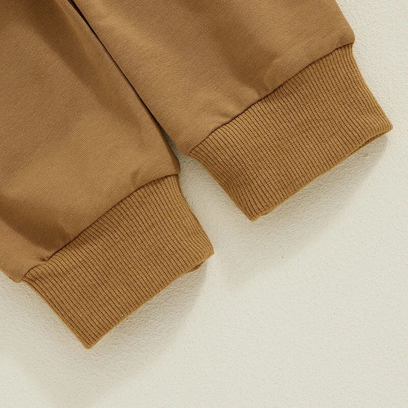 Dress your little one in festive style with this charming "Little Pumpkin" set, perfect for celebrating Halloween. The white sweatshirt is adorned with the playful "Little Pumpkin" embroidery in warm autumn tones, adding a seasonal touch that's ideal for the spooky season. Paired with cozy brown pants featuring an elastic waistband, this outfit ensures comfort and ease for active toddlers.