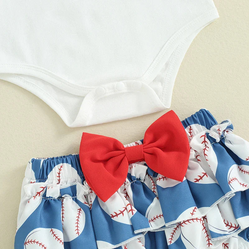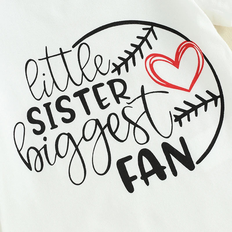 Get your little one ready for game day with this adorable baby girl baseball outfit. The set includes a short-sleeve onesie featuring the playful phrase "Little Sister Biggest Fan," perfect for showing off her support. The ruffled bloomers are adorned with an all-over baseball print and accented with a charming red bow, adding a sporty and cute touch to the ensemble. A matching headband with a bow completes the look. Made from soft, breathable fabric, this outfit ensures your baby stays comfortable and stylish whether she's cheering from the stands or playing at home.