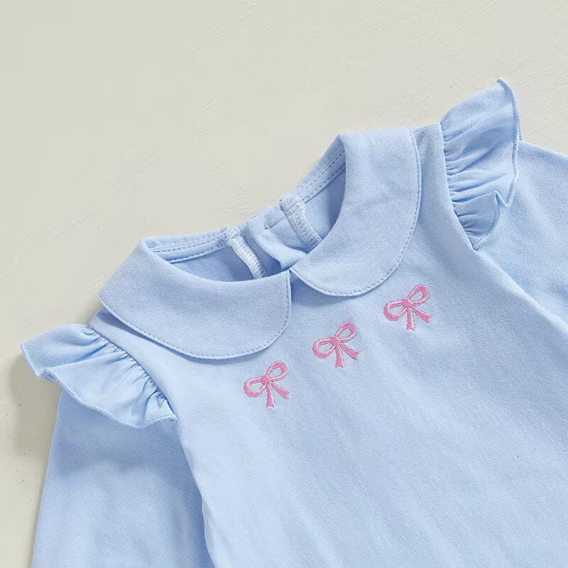 This adorable baby girl jumpsuit combines timeless elegance with practical design. Featuring a soft pastel blue hue, it is accented with delicate pink bow embroidery on the chest and frilly ruffle details on the collar and sleeves. The back snap closure makes dressing and diaper changes a breeze for busy parents. Perfect for special occasions, family gatherings, or everyday charm, this jumpsuit is a delightful addition to any baby's wardrobe.