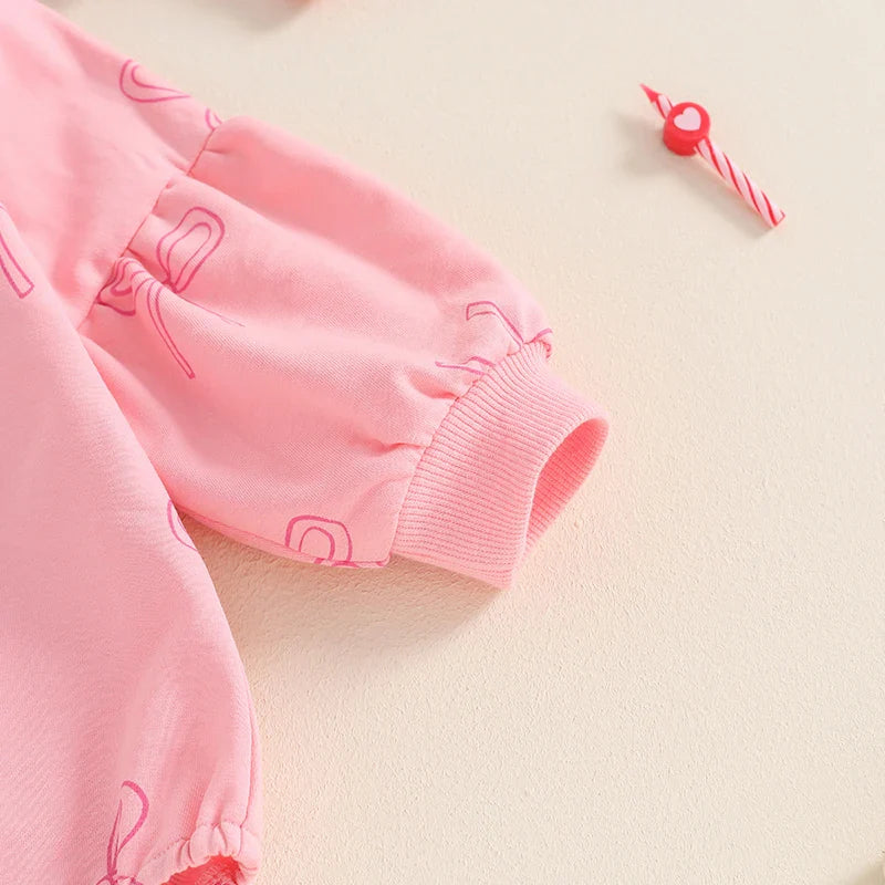 Get your little one dressed in adorable style with this baby girl long-sleeve bubble romper. This charming romper features a delightful bow print, adding a playful and cute touch to her outfit. The romper comes with puffed long sleeves and a comfortable round neckline, ensuring your baby girl stays cozy and stylish. A matching bow headband completes the look, making it perfect for special occasions, family photos, or everyday wear. The snap closure at the bottom allows for easy diaper changes, adding convenience to this fashionable ensemble. Baby girl long-sleeve romper with a cute bow print