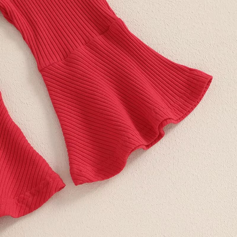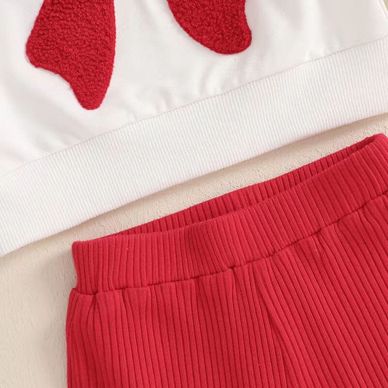 This enchanting little girl's set is perfect for St. Valentine's celebrations, featuring a crisp white top with a bold red bow applique that adds a touch of festive charm. The set is paired with vibrant red, ribbed flared pants that are both stylish and comfortable, perfect for a day of love-themed activities. A matching red bow headband completes this adorable ensemble, making your little one the star of any Valentine's event.