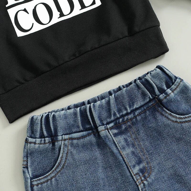 This trendy little boy's set is designed with the modern mini-man in mind, featuring a bold "BRO CODE" print on a classic black sweatshirt that's sure to make a statement. Paired with stylishly distressed denim jeans, this outfit combines comfort with cool, ensuring your little one is both chic and comfortable. Perfect for casual outings or playdates, this set is versatile enough to suit any occasion. Elevate your little boy’s wardrobe with this effortlessly fashionable set, tailored to keep up with his adventures.