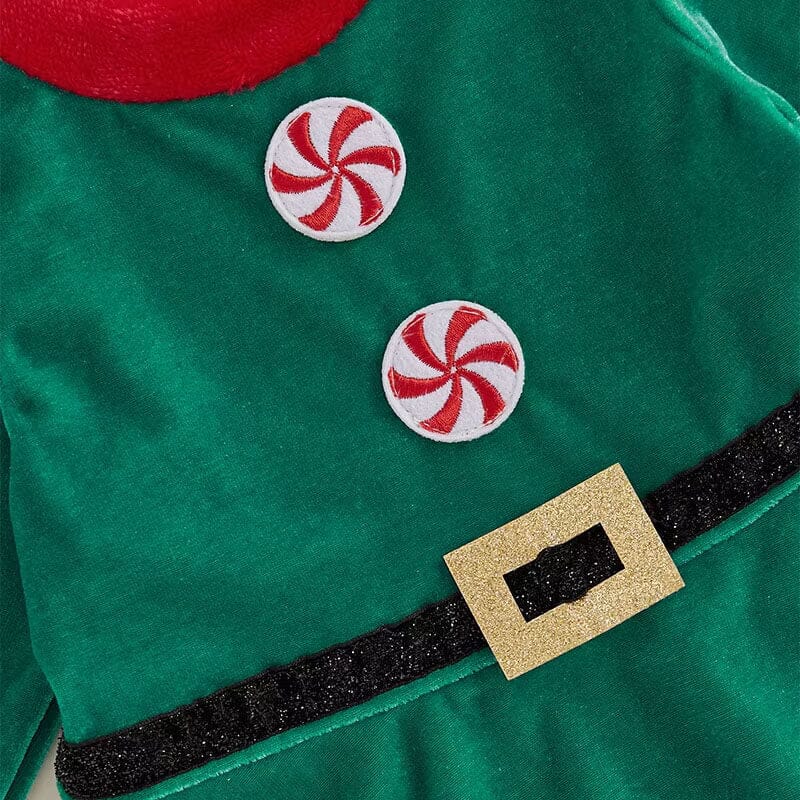 Transform your little one into a delightful helper this holiday season with our enchanting Christmas elf dress costume. This vibrant ensemble features a rich green velvety dress trimmed with bold red accents and adorned with whimsical candy cane appliqués that capture the spirit of the season. The matching pointed elf hat completes the magical look, making your toddler the star of any Christmas celebration. Perfect for holiday parties or as a fun dress-up option, this costume is sure to spread joy and smiles wherever it goes