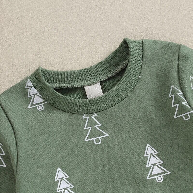 Embrace the timeless charm of the holidays with this beautifully crafted ensemble. The green sweatshirt, featuring subtle and minimalistic Christmas tree prints, captures the serene beauty of wintry forests in a contemporary style. Complemented by matching pants, the outfit offers a harmonious look that's both festive and chic.