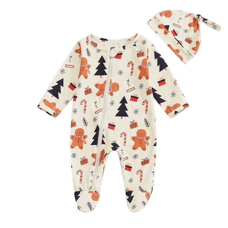 Celebrate the holiday season with this adorable unisex baby jumpsuit, festooned with charming Christmas motifs. The design features cute gingerbread men, candy canes, and festive trees scattered across a neutral background, making it a delightful choice for December. Easy to slip on and off, it includes convenient snaps for quick diaper changes, ensuring that both style and comfort are delivered in equal measure.