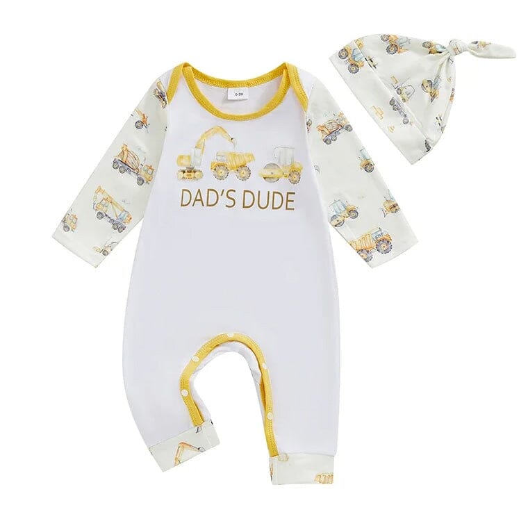 This charming baby boy jumpsuit features a fun "Dad's Dude" print, making it a perfect gift for the little man who loves spending time with dad. Adorned with delightful construction vehicle graphics, it adds a playful touch to his wardrobe. A matching hat with a similar construction theme completes the look, keeping your little one cozy and stylish. Its practical snap closures make dressing and diaper changes a breeze, combining functionality with adorable design.