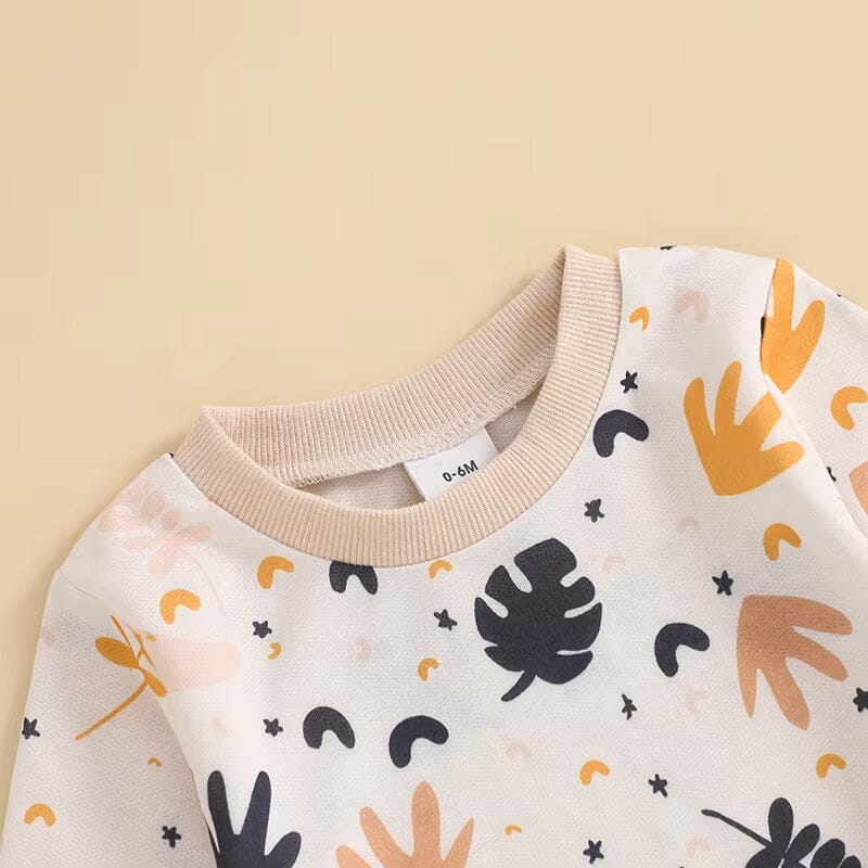 Roar into comfort and style with our dinosaur-themed toddler set, where prehistoric fun meets modern fashion. This charming set includes a cozy sweatshirt and matching pants adorned with playful dinosaur and leaf motifs in a trendy, muted color palette. Perfect for budding paleontologists, this set blends whimsy with practicality, making it a must-have in any young adventurer's wardrobe.