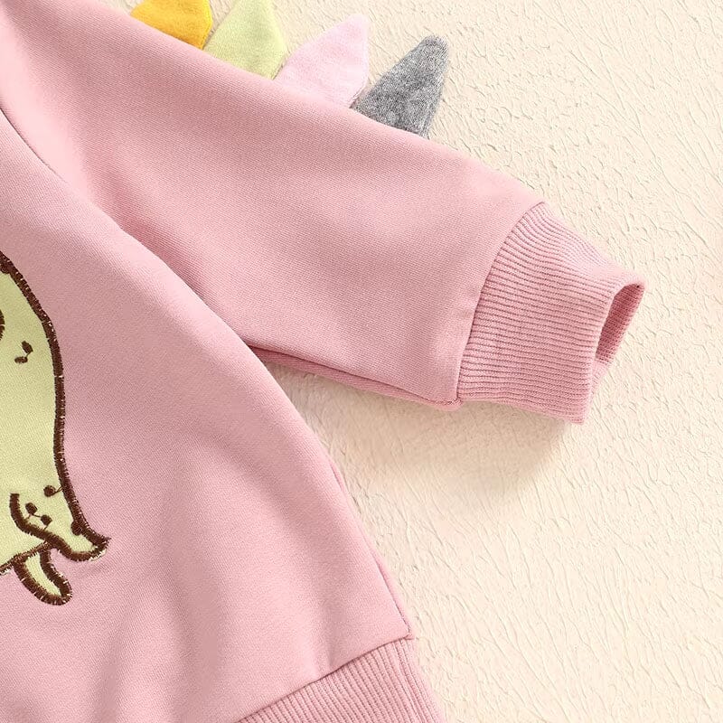 This delightful unisex baby set features playful dinosaur appliques that bring a dash of whimsy to any child's wardrobe. Available in soothing beige and gentle pink, these sets are perfect for any little explorer. The colorful geometric accents on the sweatshirt add a fun, modern touch while keeping the look versatile and kid-friendly. Ideal for both indoor play and outdoor adventures, this set combines comfort and style with a charming prehistoric twist.
