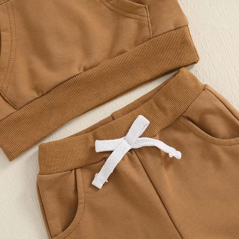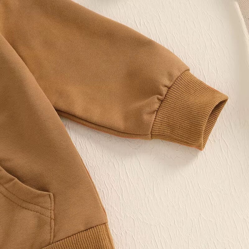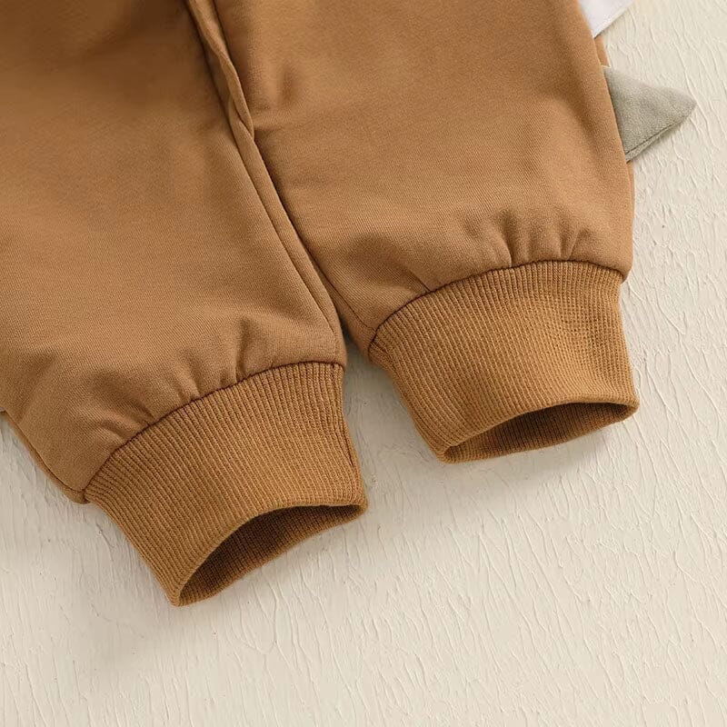 Dress your little adventurer in these playful and comfy dinosaur-themed hoodie sets, available in warm brown and cool blue. Each set features a soft, cotton-blend hoodie with fun dinosaur spikes on the hood and a matching dinosaur appliqué on the chest. The pants are designed with durability in mind, perfect for active toddlers, and include the same playful spikes on the legs for a cohesive look. The kangaroo pouch pocket on the hoodie adds functionality, allowing your child to carry their small treasures.